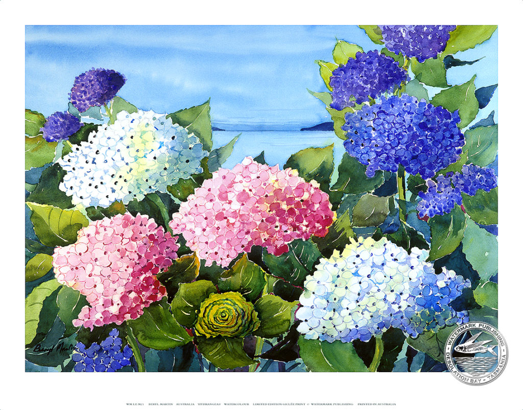 HYDRANGEAS – Beryl Martin – GICLEE LIMITED EDITION – 65 x 83cm. This is a limited edition reproduction of the original watercolour by South Australian artist Beryl Martin. A beautiful detailed close up of a hydrangeas bush, from Beryl’s own garden. This high quality giclee print is printed on watercolour paper.